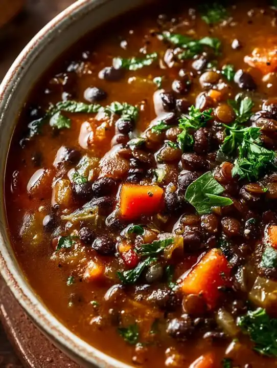 A hearty and nutritious soup combining earthy lentils and smoky black beans for a filling plant-based meal.