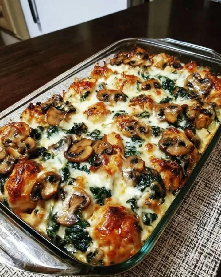 A cozy, low-carb chicken bake with mushrooms and spinach in a creamy garlic sauce, perfect for easy weeknight meals.