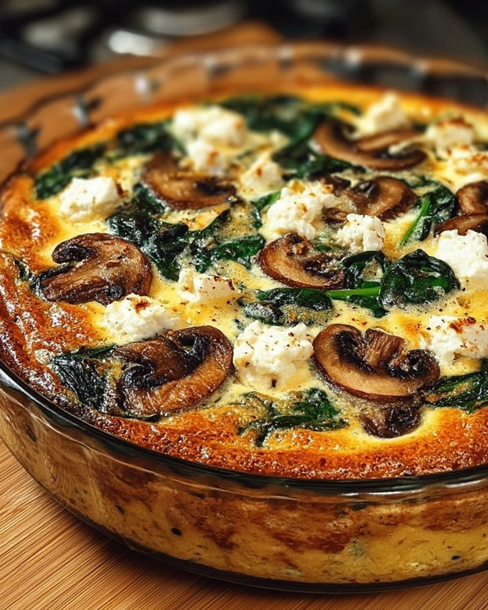 A cozy, simple dish blending tangy feta, tender mushrooms, and bright spinach into a custardy base, perfect for breakfast, brunch, or a light dinner.