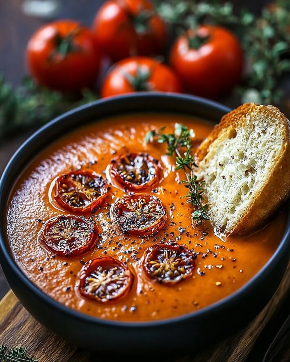 A comforting and silky soup made with roasted tomatoes and garlic, perfect for any time of year.