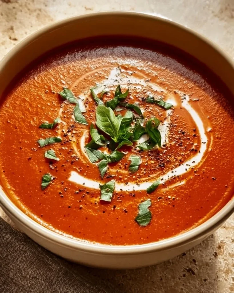 A warm and comforting bowl of creamy tomato basil soup made with ripe tomatoes, fresh basil, and a touch of cream.
