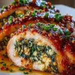 Juicy chicken, a creamy spinach-feta filling, and a crunchy golden crust finished with a sweet heat drizzle. These crispy stuffed chicken rolls look fancy but take simple steps. They bake up tender inside and crisp outside, and the hot honey glaze brings a warm, sticky shine that makes every bite pop. Perfect for weeknights, date nights, or when you want something special without stress.