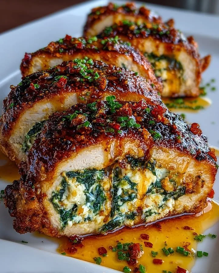 Juicy chicken rolls stuffed with a creamy spinach and feta filling, finished with a sweet and spicy hot honey glaze. Perfect for weeknights or special occasions.
