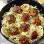 A vibrant Mediterranean dish featuring savory chicken meatballs served over refreshing lemony orzo.
