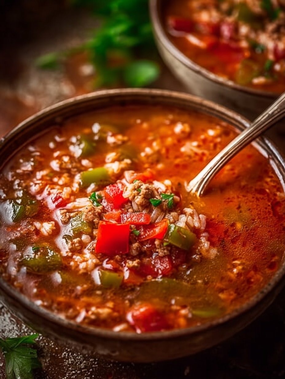 A comforting one-pot meal that combines the flavors of stuffed peppers in a warm, savory soup.