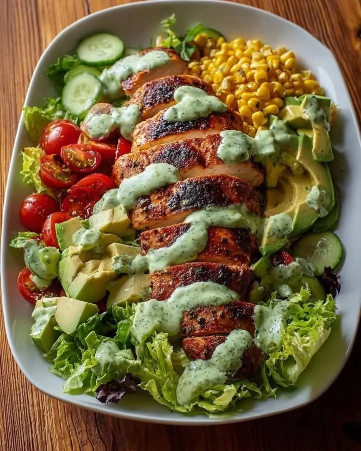 A fresh and satisfying grilled chicken salad featuring creamy avocado and a zesty herb dressing, perfect for healthy meals.