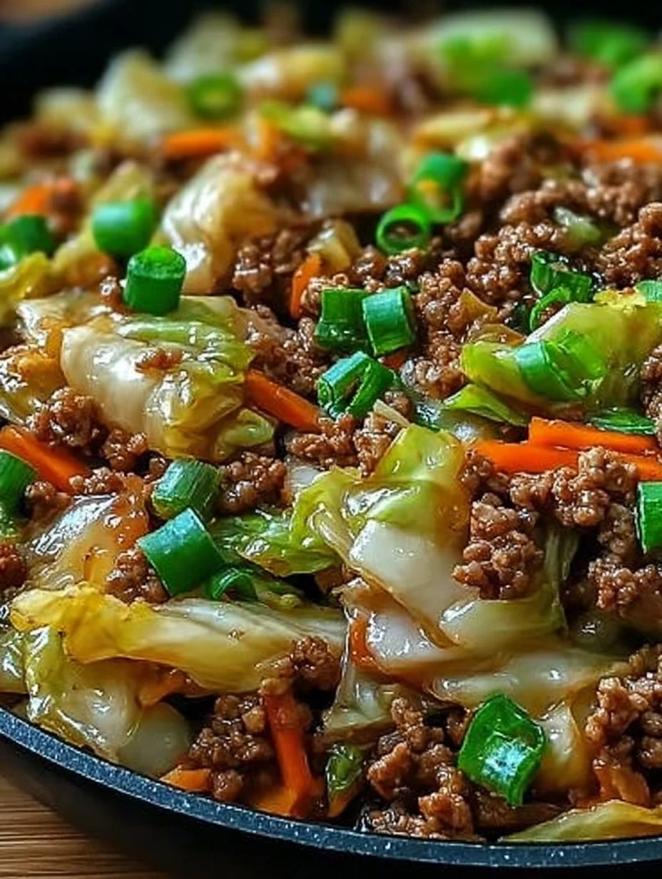 A quick and savory stir-fry featuring lean ground beef and crunchy cabbage, perfect for a weeknight meal.