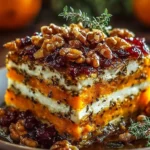 This Layered Sweet Potato, Butternut Squash & Carrot Lasagna with Feta, Walnuts, and Cranberry-Honey Glaze is a cozy, colorful main that brings autumn produce to the center of the plate. It layers thin roasted root vegetables with tangy feta, crunchy walnuts, and a bright cranberry-honey glaze for contrast. Perfect for holiday tables or a weekend dinner, this lasagna looks impressive but stays simple to prepare.