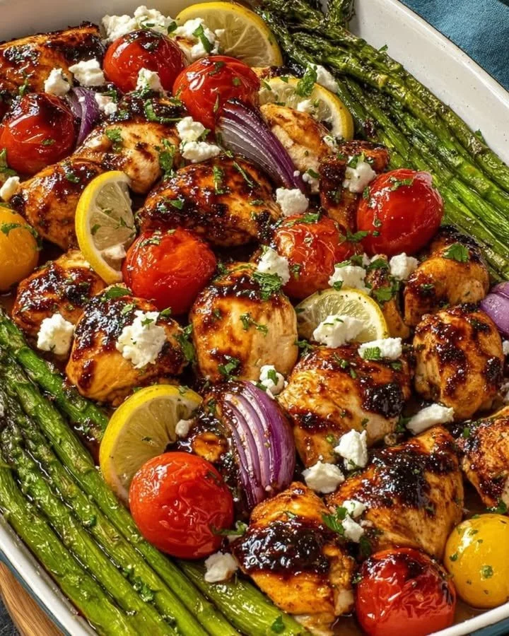 A bright and zesty one-pan meal featuring tender chicken, roasted potatoes, and colorful veggies topped with creamy feta.
