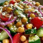 A bright and crisp salad combining tender chickpeas, cool cucumber, juicy tomatoes, briny olives, and creamy feta with a zesty lemon-oregano dressing.