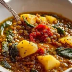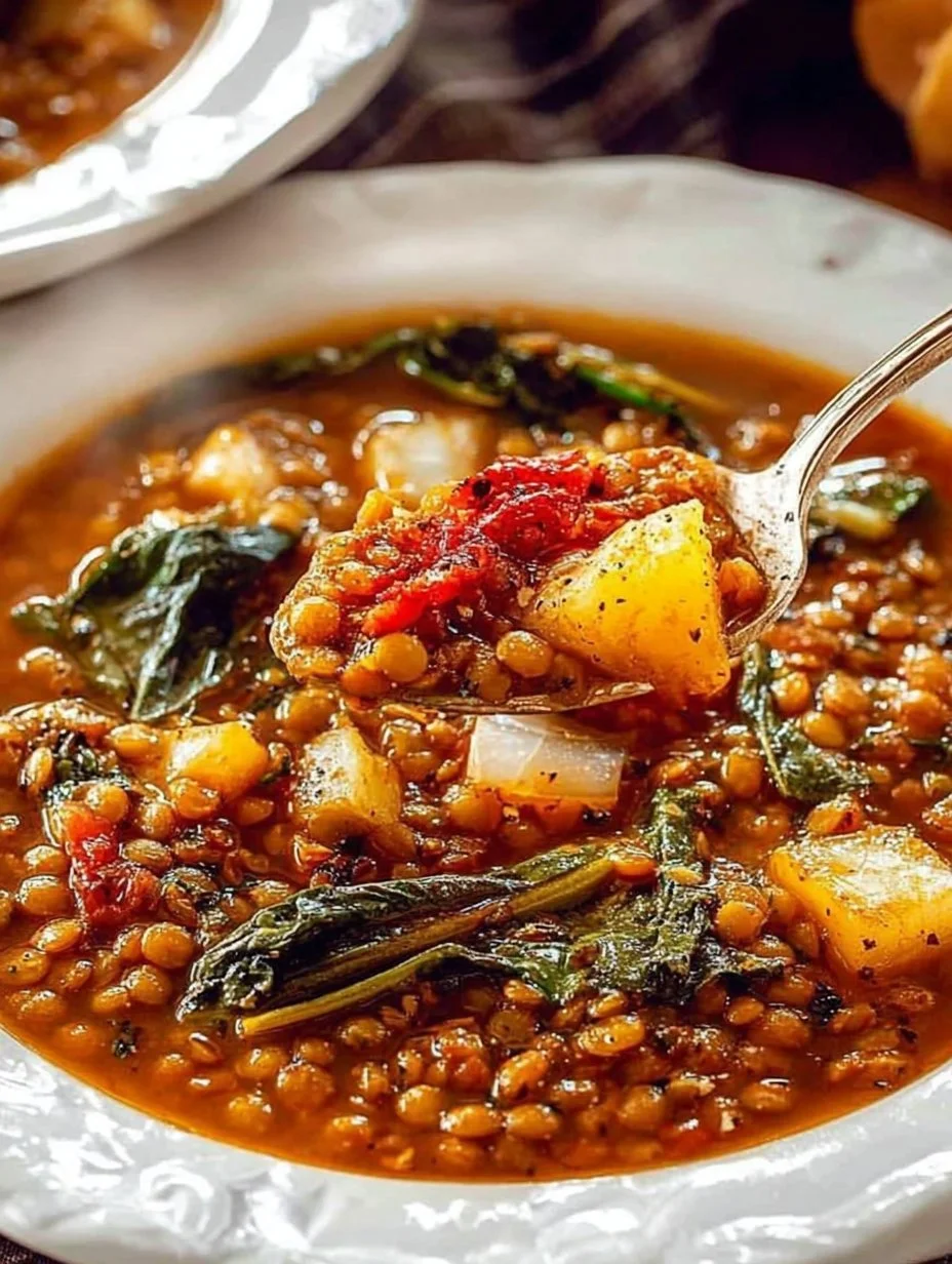 A warm and comforting bowl of Mediterranean Lentil Soup, combining earthy lentils with bright citrus and herb notes.