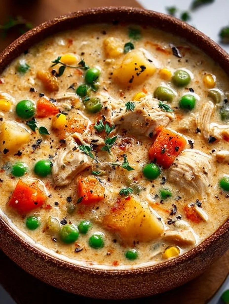 A cozy, creamy soup that combines the comforting flavors of chicken pot pie without the fuss, made easily in a slow cooker.