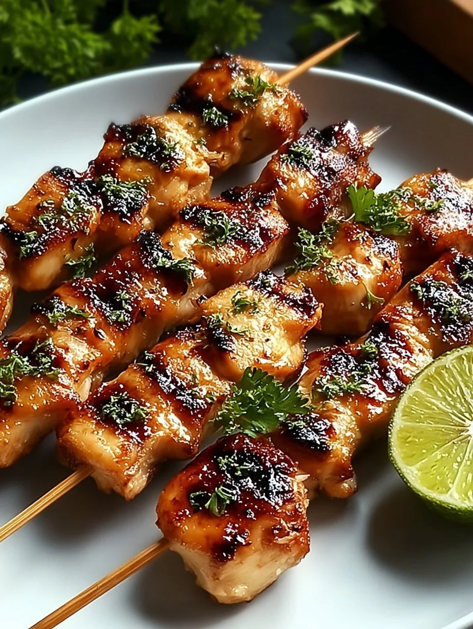 Step 6: Preheat grill (or grill pan) to medium-high, about 400–450°F. Oil grates. Grill skewers 10–12 minutes, turning every 3–4 minutes, until chicken is lightly charred and reaches 165°F. Boil the reserved marinade for 1–2 minutes and brush on during the last minute.